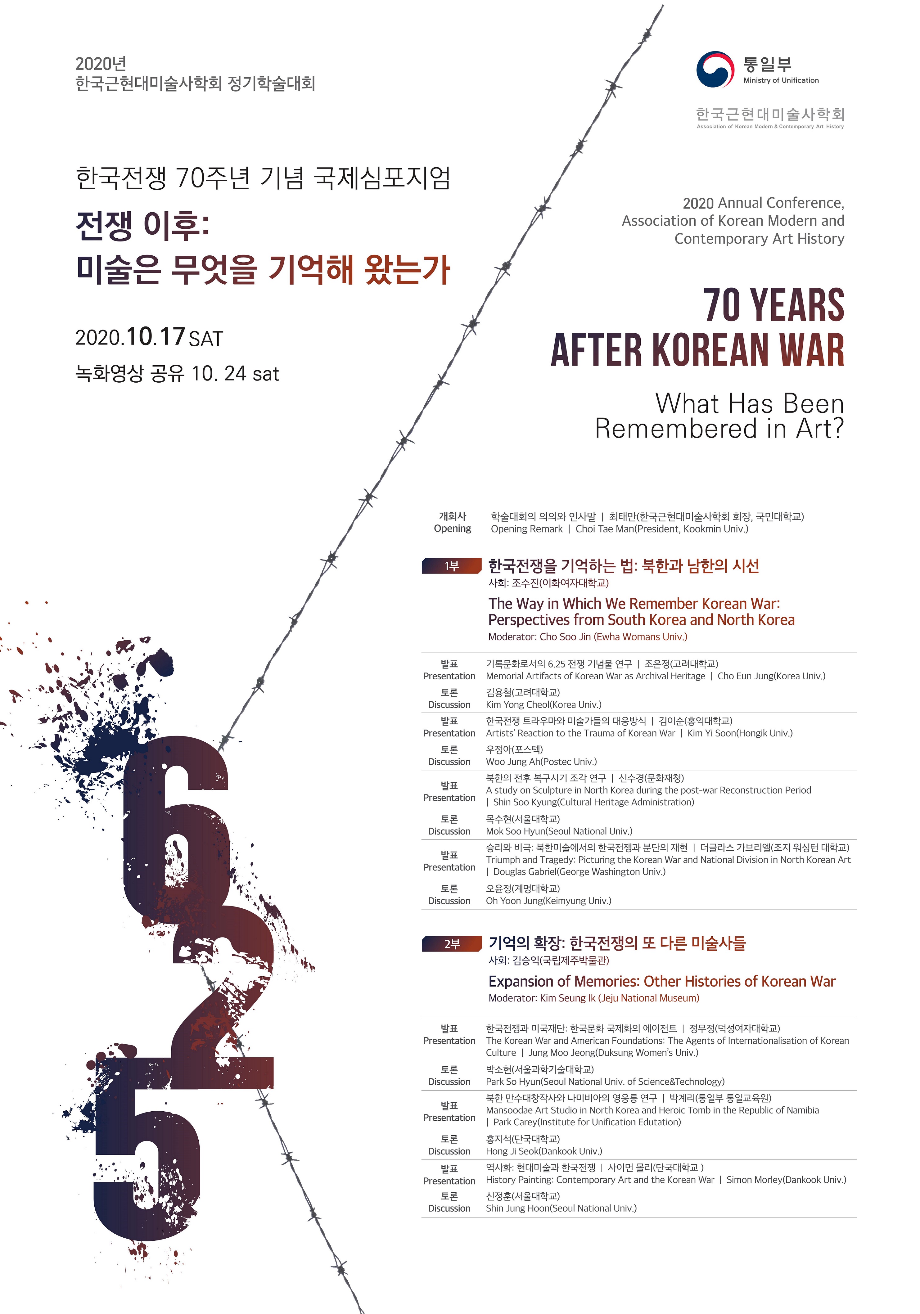 한국근현대미술사학회는 한국전쟁 70주년을 기념하여 2020년 가을 정기학술대회 《전쟁 이후: 미술은 무엇을 기억해 왔는가》를 개최합니다.
