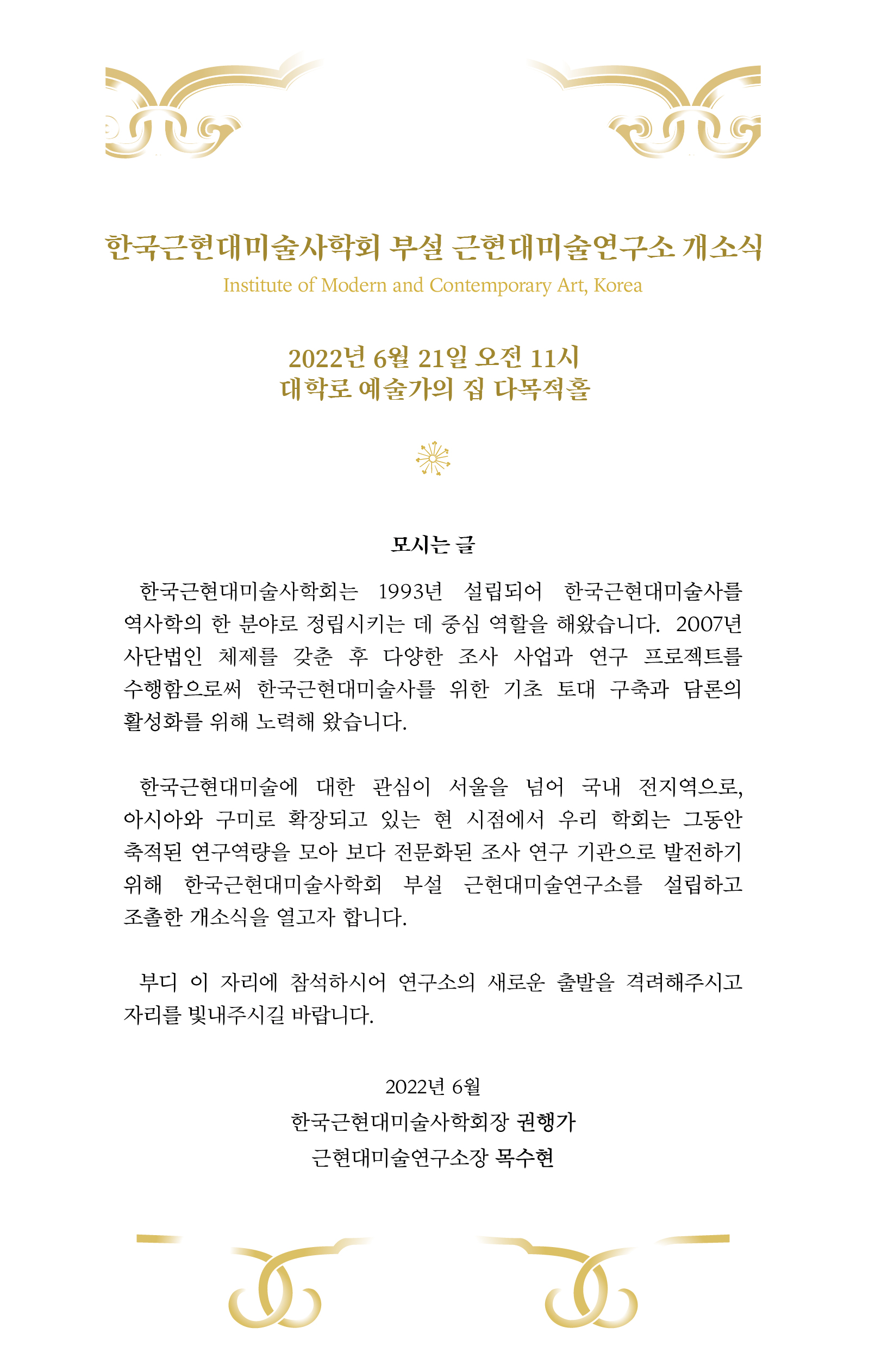 > 알림마당 > 학회소식우리 학회는 2022년 6월 학회 부설 근현대미술연구소(Institute of Modern and Contemporary Art, Korea)를 설립하여 오는 6월 21일 대학로 예술가의 집 다목적홀에서 개소식을 개최합니다.