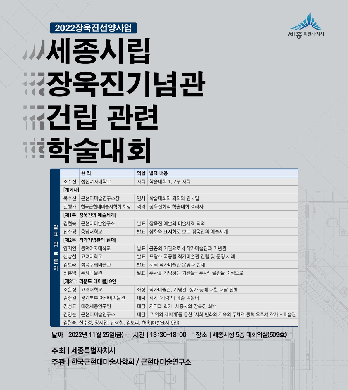 오는 11월 25일(금) 세종시청 5층 대회의실(509호)에서 <세종시립 장욱진 기념관 건립 관련 학술대회>를 개최합니다.