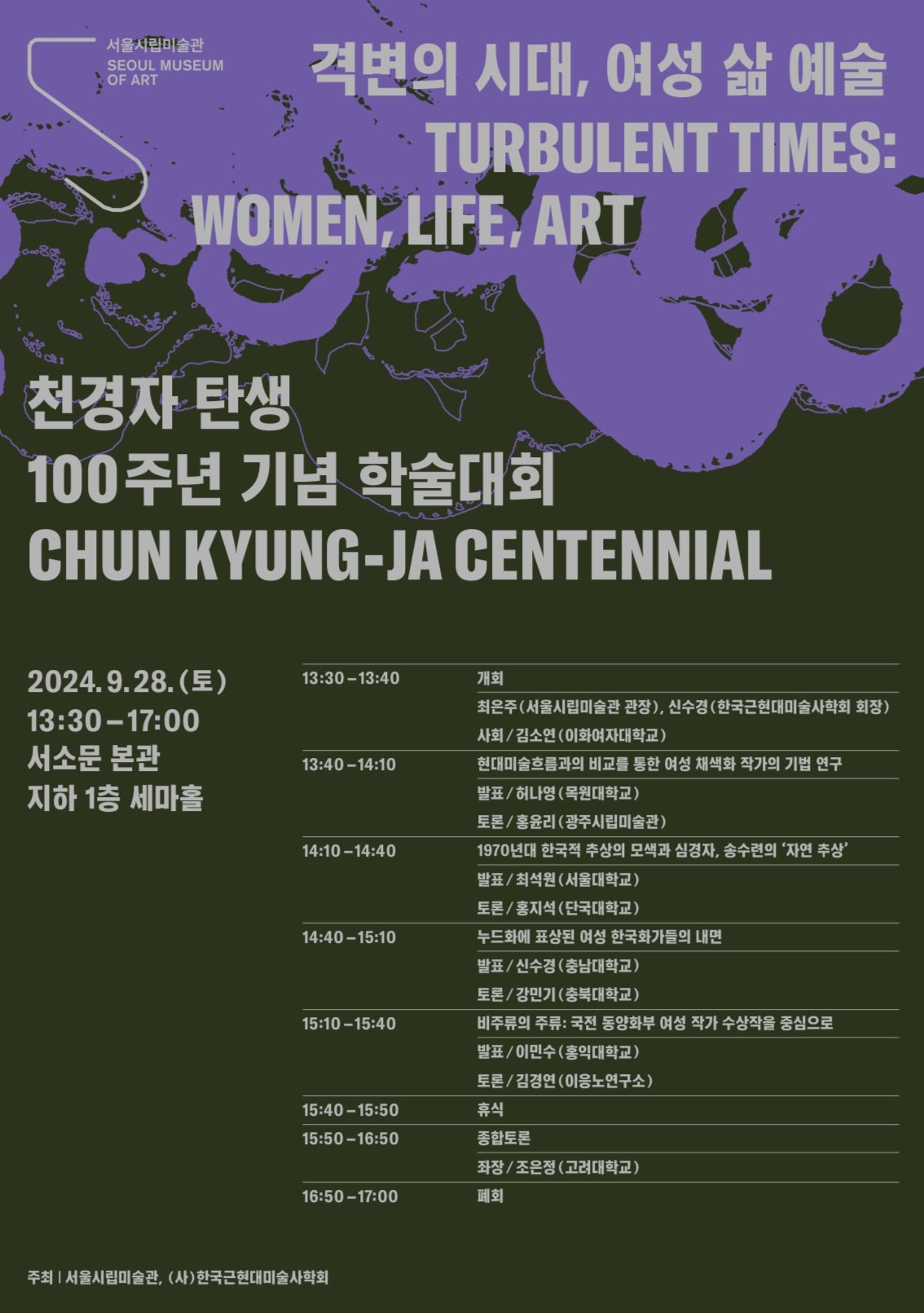안녕하세요. 서울시립미술관과 (사)한국근현대미술사학회는 오는 9월 28일(토)에 천경자 탄생 100주년 기념 전시 《격변의 시대, 여성 삶 예술》과 연계하여 학술대회를 개최합니다.